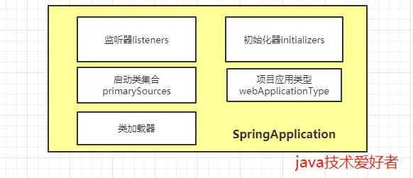 创建了SpringApplication实例之后,就完成了SpringApplication类的初始化工作,这个实例里包括监听器、初始化器,项目应用类型,启动类集合,类加载器。如图所示。