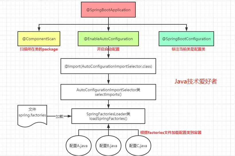 Spring Boot 的自动配置是通过 @EnableAutoConfiguration 注解实现(@SpringBootApplication 实际上包含了 **@EnableAutoConfiguration**,从而启用了自动配置功能),这个注解包含@Import({AutoConfigurationImportSelector.class})注解,导入的这个类会去扫描 classpath 下所有的 META-INF/spring.factories 中的文件,根据文件中指定的配置类加载相应的 Bean 的自动配置。