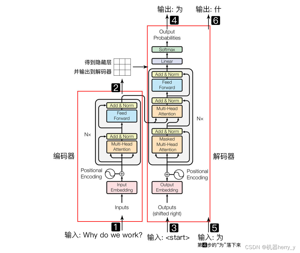 解码器的任务是根据从编码器接收到的嵌入来生成翻译后的文本(目标语言),其中 编码器是双向 的,解码器是单向 的,需要循环迭代输出。