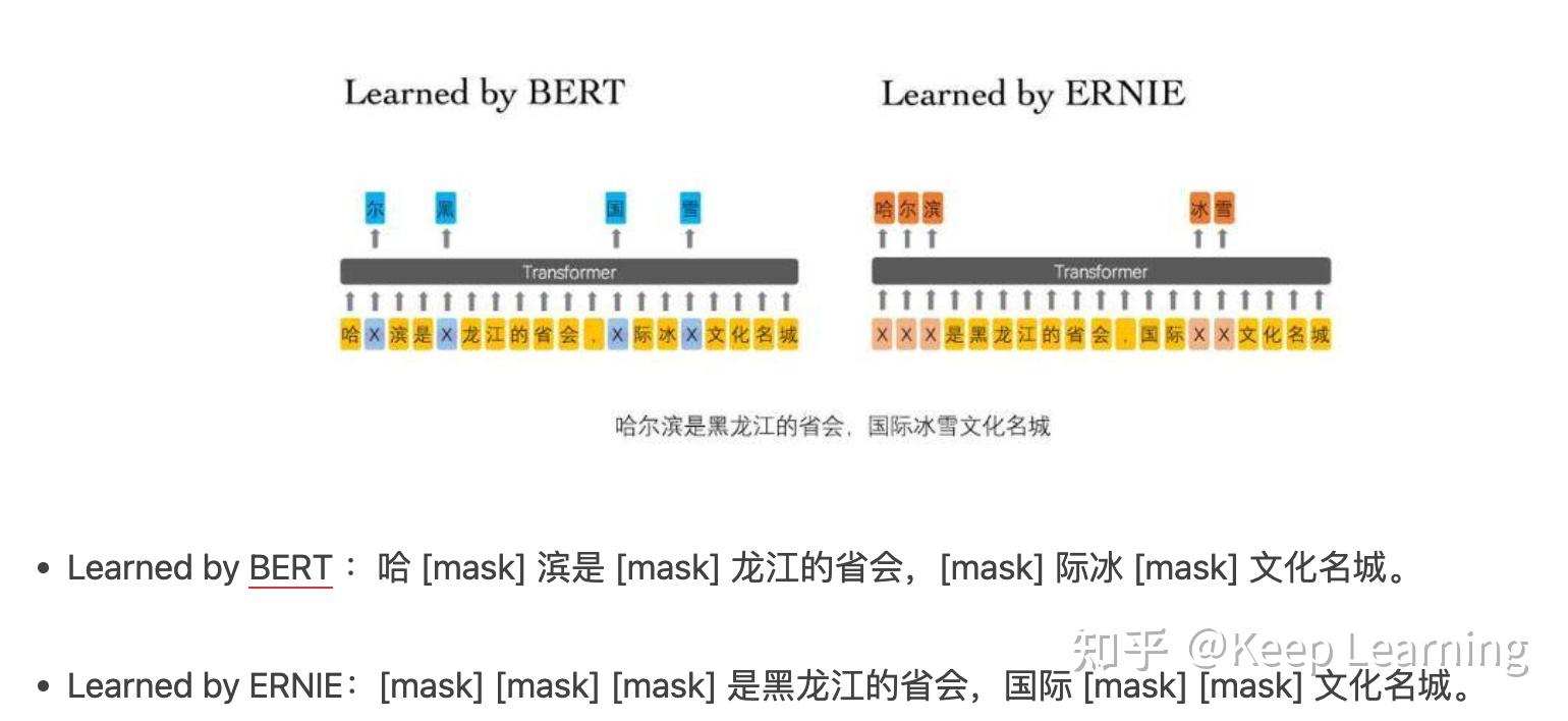 因此,如果模型能够学到这些先验知识,那模型应该可以获得更可靠的语言表征。ERNIE 的改进主要体现在 mask 的方式上,将中文单字的 mask 改为 连续的实体词和短语 mask。